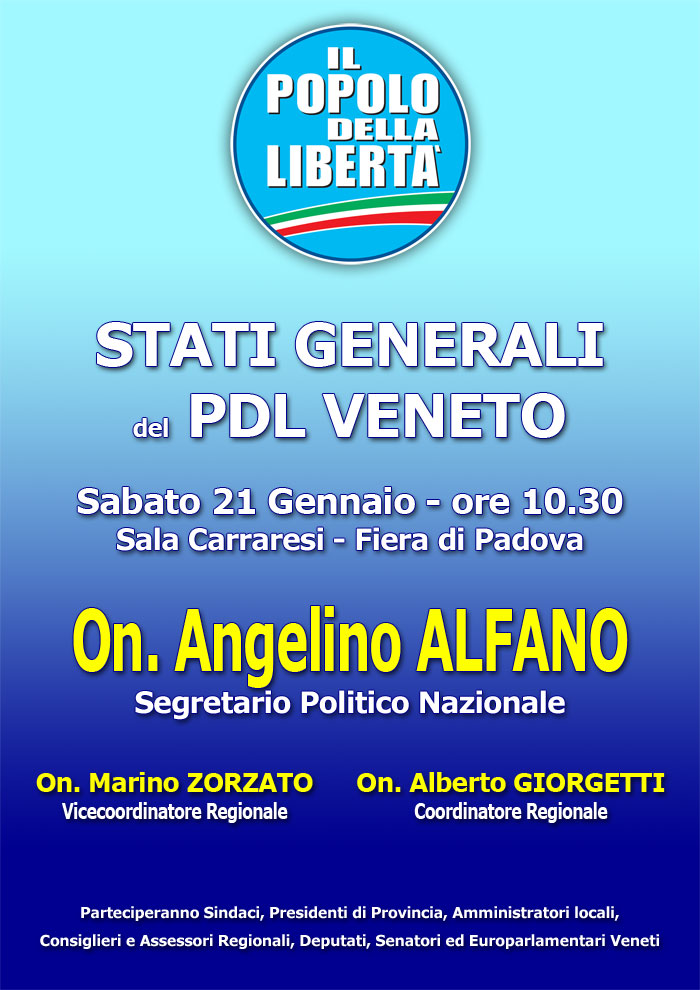 Sabato 21 Gennaio 2012 a Padova in zona fiera – sala Carraresi , la segreteria regionale del Popolo della Libertà del Veneto organizza gli Stati Generali del PDL. Sarà un occasione per amministratori, militanti, iscritti e simpatizzanti di fare il punto della situazione dello stato di salute del partito, ma anche di poter fornire le linee guida per una buona amministrazione dei Governi nazionale e locali. Interverrano Parlamentari, Sindaci e Presidenti di Provincia, oltre che gli Assessori e Consiglieri Regionali per un’utile e democratica discussione sul futuro del partito e del Veneto, oltre che del nostro beneamato paese. Per l’occasione sarà presente l’On. Angelino Alfano, Segretario Politico Nazionale. E’ un importante incontro in vista della celebrazione dei congressi provinciali e di grande città che si terranno in Veneto nel mese di Febbraio.