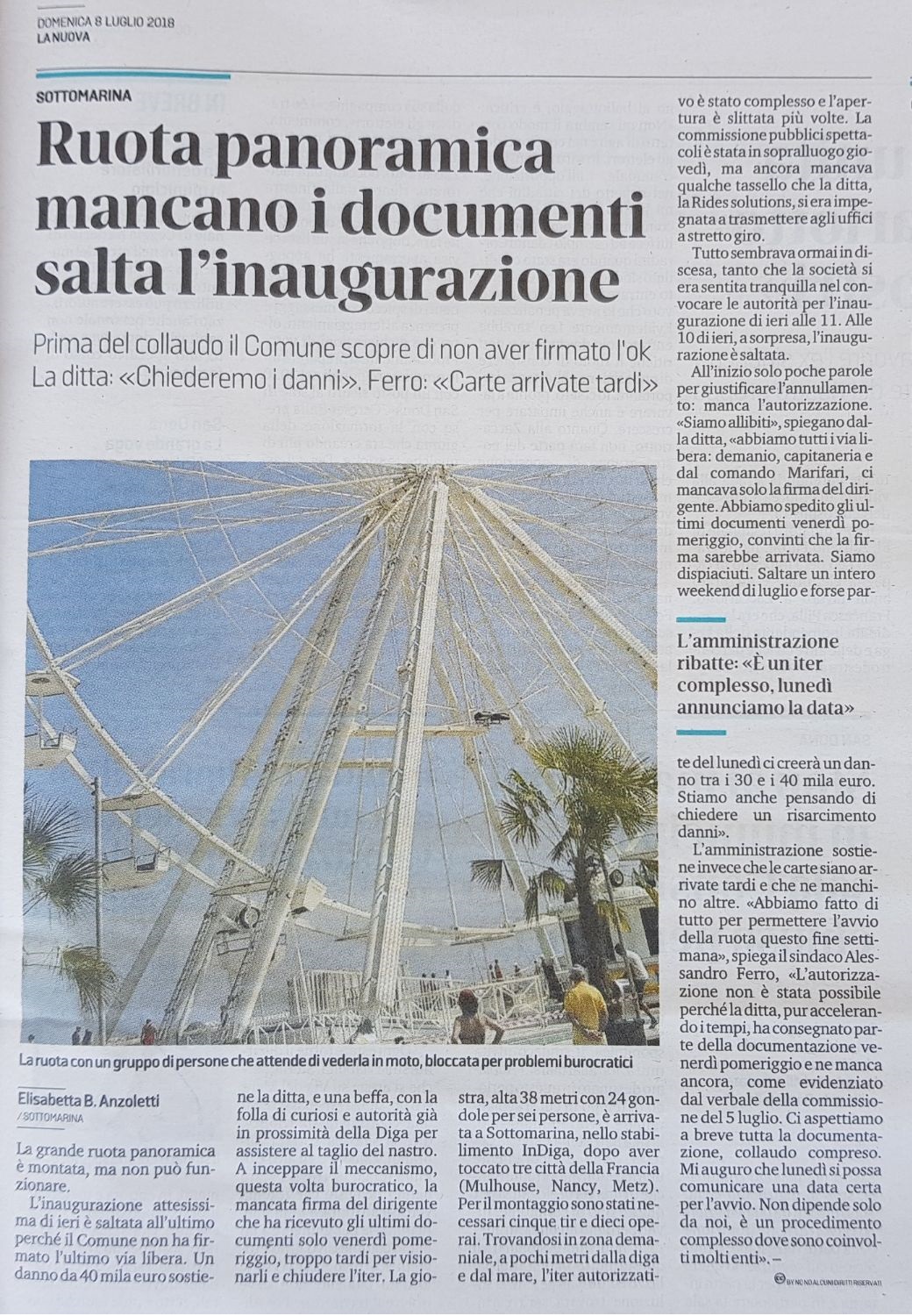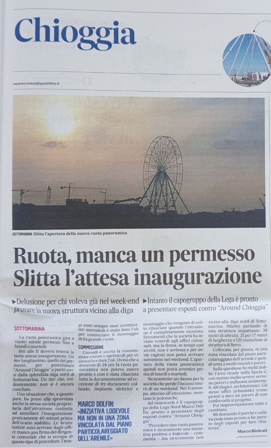 Dopo un mio intervento sulla stampa del 30.06.2018, per i gravi ritardi nell’installazione della ruota panoramica in zona Diga, e la secca replica del Sindaco che comunque si era esposto con delle certezze e delle scadenze, a tal punto che sabato 07/07/2018 si sono presentate 1000 persone all’apertura dell’attrazione (che puntualmente è saltata) domenica 08.07.2018 altri articoli di stampa hanno sconfessato tutte le sparate del Sindaco che non sapeva quello che diceva, fino ad arrivare al Telegiornale Rai  TGR Veneto.