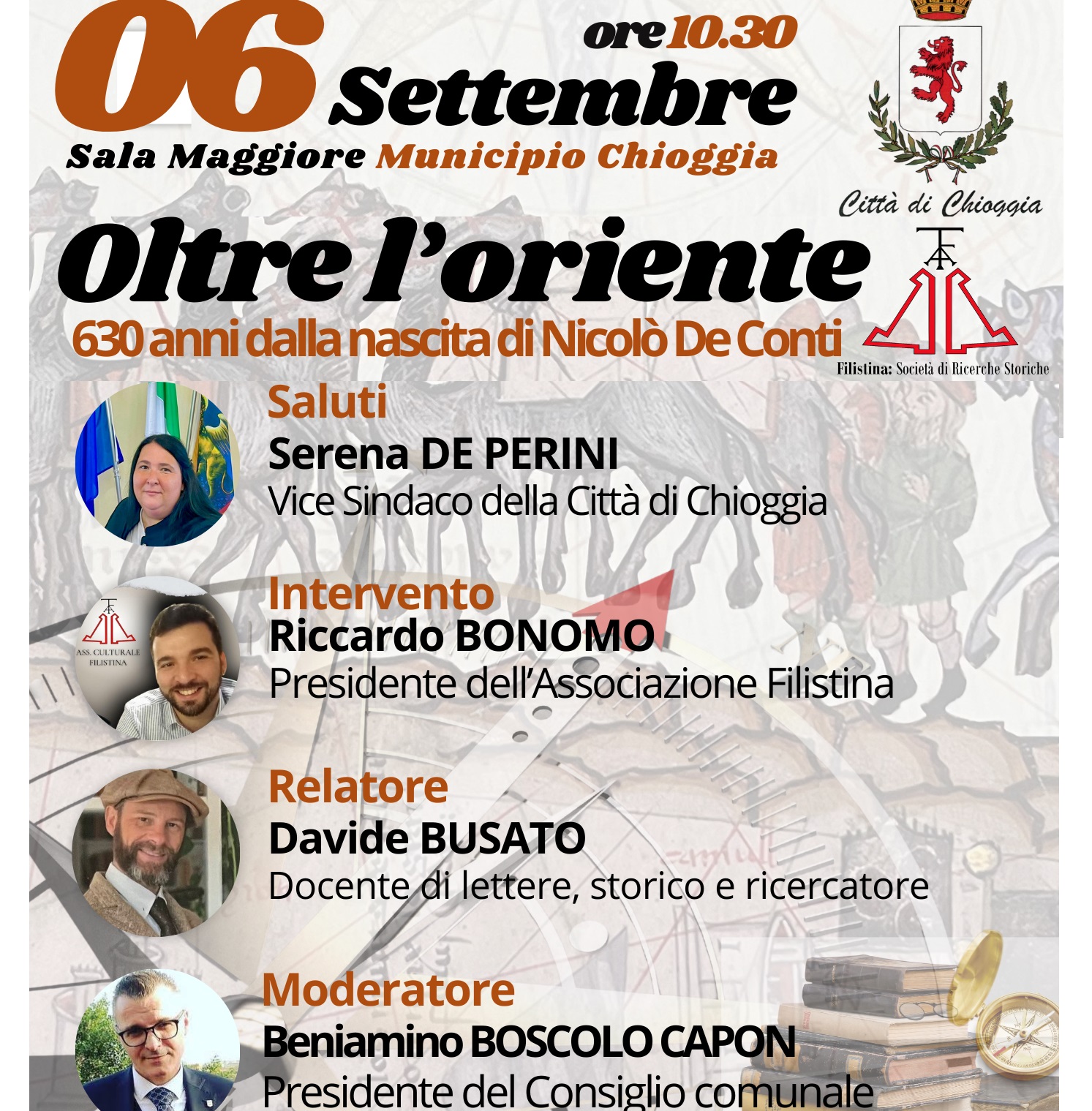 La Sala Maggiore del Municipio si è trasformata nella mattinata di sabato 6 Settembre in un ponte ideale tra passato e presente, tra la laguna e l’Oriente, tra istituzione e cultura, tra storia e società civile… per celebrare i 630 anni dalla nascita di Nicolò De Conti, il grande viaggiatore chioggiotto che seppe